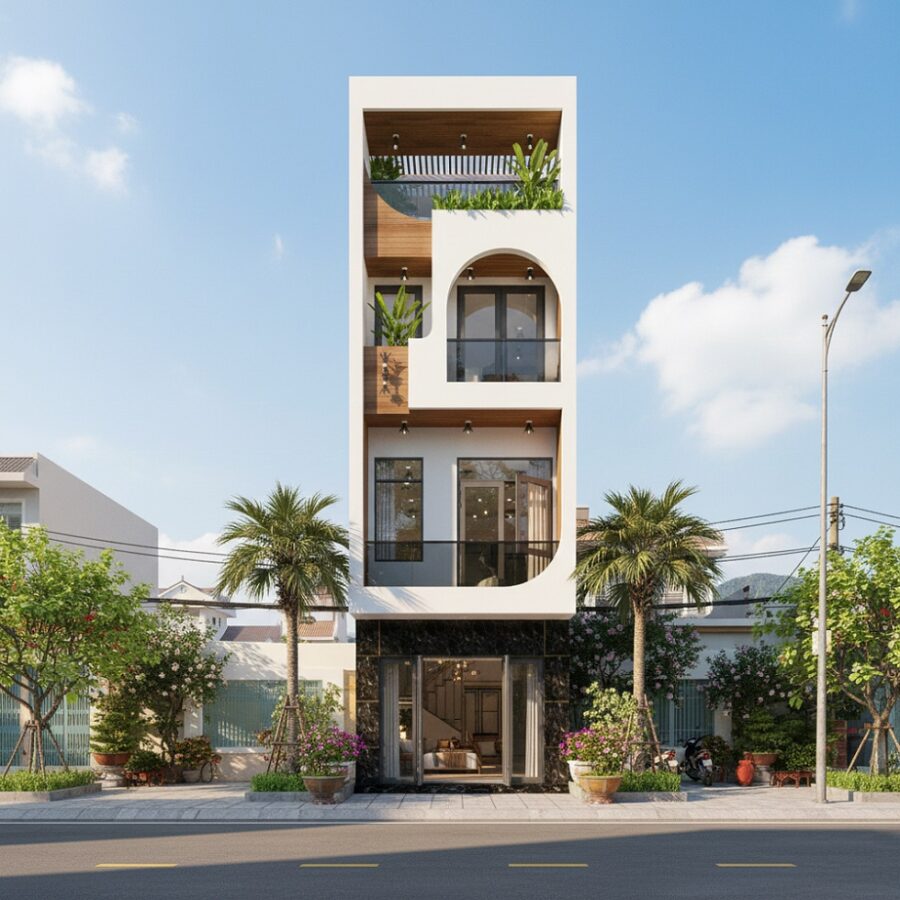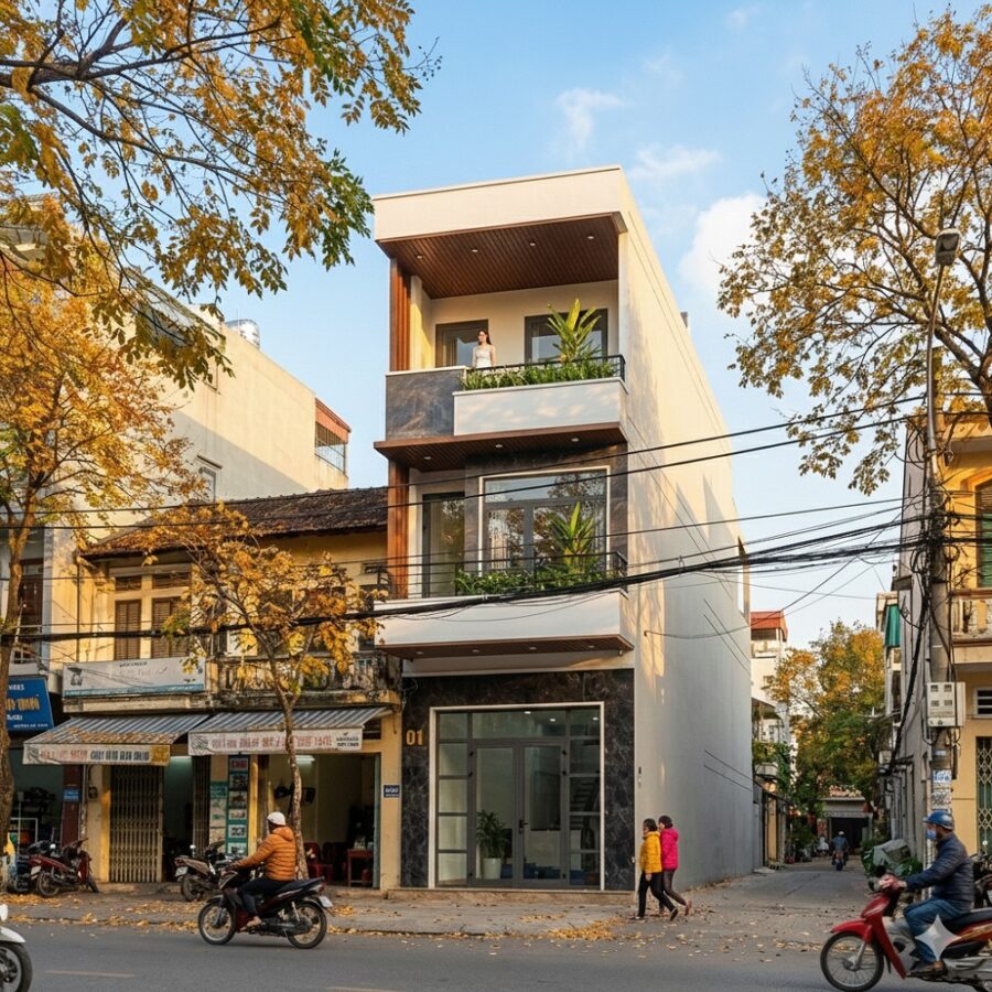 Nhà phố 3 tầng lệch 5m. Công trình là nhà ở kết hợp kinh doanh ở tầng trệt. Phương án