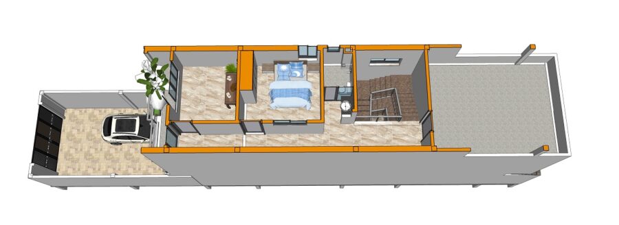Trước là sân để xe, phòng khách và không gian bếp, 1 vệ sinh nhỏ