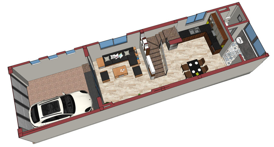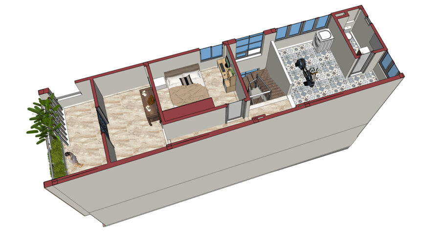 Tầng 1: Có gara, phòng khách bếp, vệ sinh nhỏ cuối nhà