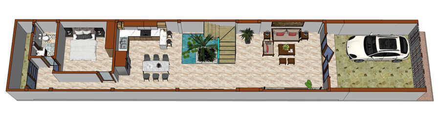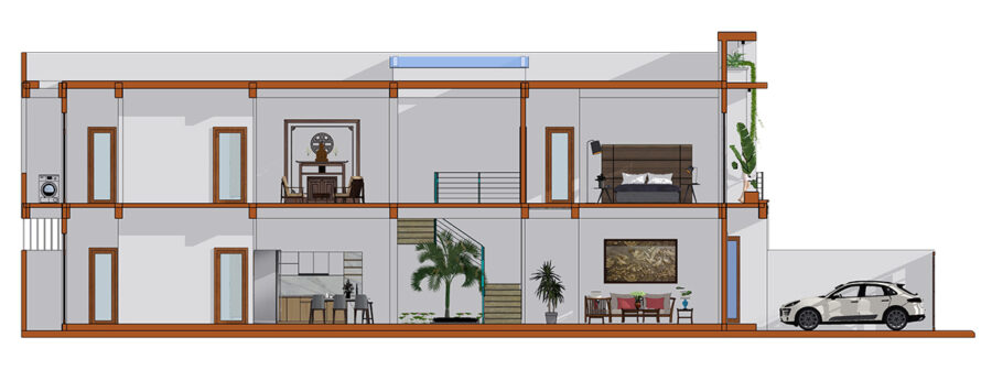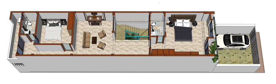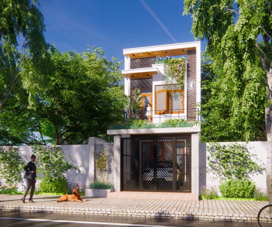 Tầng 1: Gara, phòng khách liên thông không gian bếp, phòng ngủ nhỏ, vệ sinh cuối nhà