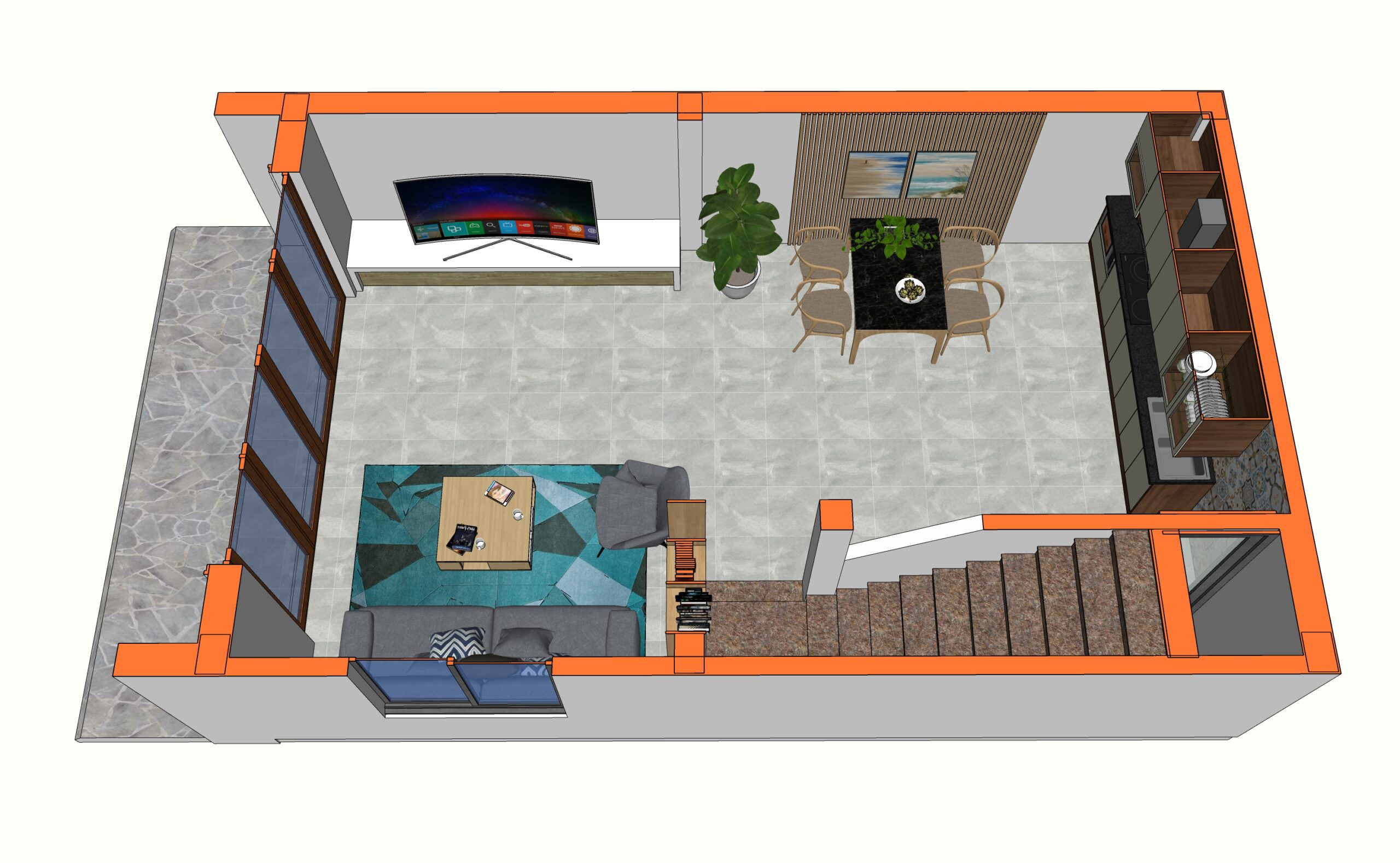 Tầng 1: Không gian phòng khách và không gian bếp liên thông