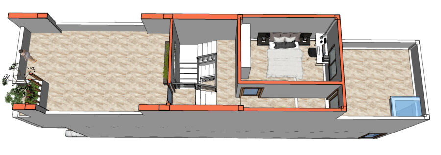 Ý tưởng thiết kế 3 tầng lệch với chiều cao tầng 1 là 4,2m các tầng trên chiều cao 3,6m và tầng 3 có chiều cao 3,3m. Thiết kế cầu thang có diện tích tối thiểu để tăng không gian diện tích cho các phòng ngủ.