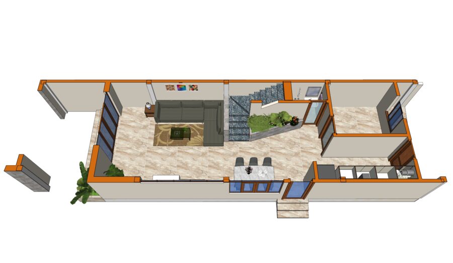 Tầng 1: Sân để xe nhỏ, phòng khách, phòng ngủ, bếp, 1 vệ sinh chung