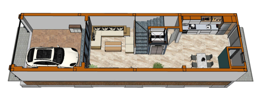 Tầng 1: Gara, phòng khách, bếp, nhà vệ sinh nhỏ, thang bộ, thang máy