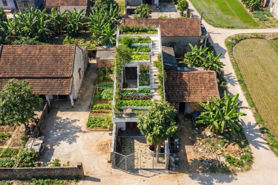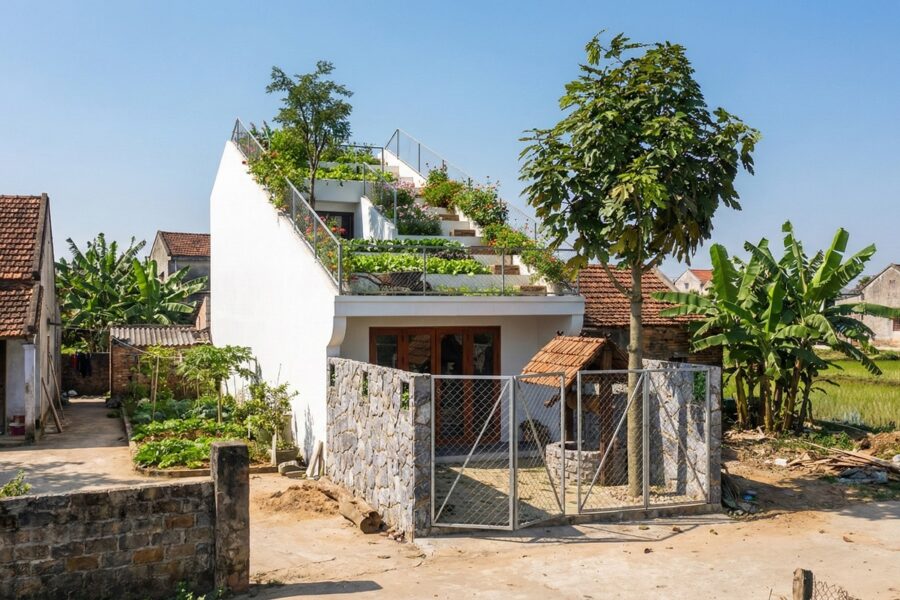 Diện tích mái chéo trồng cây, có không gian kê bàn trà và thư giãn.