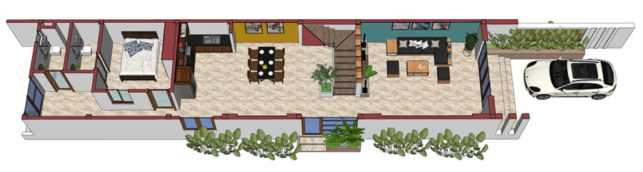Tầng 1: Phòng khách không gian bếp liên thông. Một phòng ngủ nhỏ có vệ sinh khép kín. Một vệ sinh chung