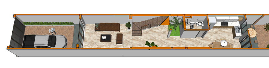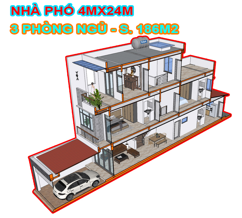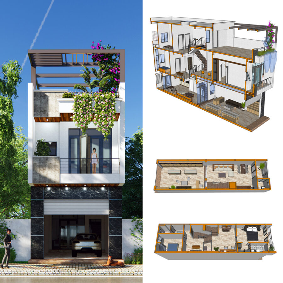 – Tầng trệt: Gara ô tô, phòng khách, bếp, một vệ sinh công chung