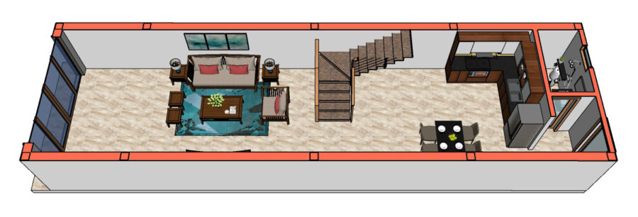 Tầng 1: không gian phòng khách, cầu thang, bếp, khu vệ sinh nhỏ và lối thoát hiểm