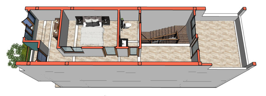 Tầng 2: 2 phòng ngủ, cầu thang và vệ sinh chung cạnh cầu thang.