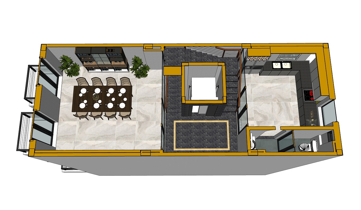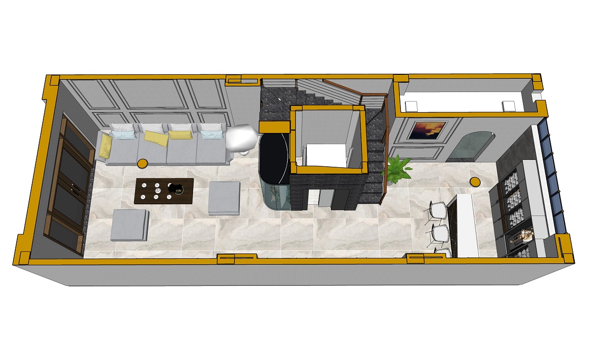 Phòng khách –> Cầu thang máy, cầu thang bộ –> Không gian phụ trợ (quầy bar, vệ sinh nhỏ)